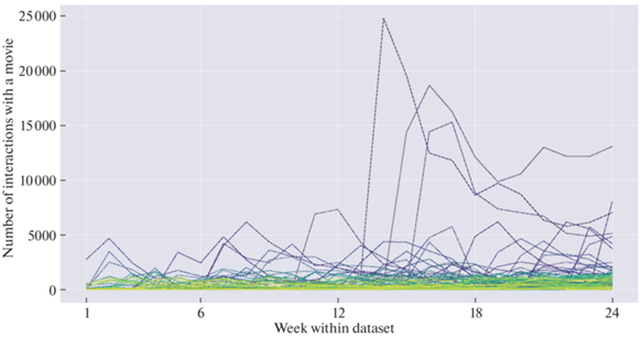Также важно подчеркнуть явные временные тренды популярности объектов. Рисунок 1b показывает растущее количество взаимодействий каждую неделю в наборе данных Kion. Рисунок 2 иллюстрирует индивидуальные скачки популярности топ-100 фильмов (за исключением сериалов) по неделям. Эти особенности распределения популярности во времени и среди объектов могут иметь заметные последствия для создания правильной схемы валидации и успешного решения задачи рекомендаций фильмов на таких данных.