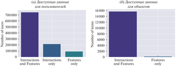 Характеристики пользователей и объектов – еще один важный аспект для систем рекомендаций. Подавляющее большинство объектов в датасете имеют и характеристики, и взаимодействия, в то время как у 30 процентов пользователей есть только одно из вышеуказанных. Рисунок 3 иллюстрирует доступность данных как для пользователей, так и для объектов.