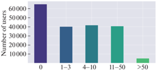 3.1.1. Метрика конкурса. В качестве основной метрики производительности мы использовали Mean Average Precision с порогом $K$ ($MAP@K$), которую измеряли на приватном наборе данных. Одна треть пользователей из приватного набора данных была представлена “холодными” пользователями (т.е. эти пользователи не имели взаимодействий во время периода, доступного для обучения моделей). Рисунок 4 показывает распределение пользователей по количеству взаимодействий в публичном наборе данных.