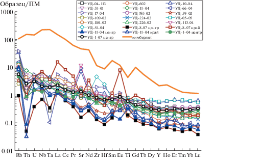 На рис. 1 приведено распределение несовместимых элементов в исследованных ксенолитах деформированных перидотитов. Как видно из графика, распределение несовместимых элементов ксенолитов не может быть объяснено контаминацией вмещающим кимберлитом. Значительная часть ксенолитов имеет положительную Sr-аномалию. В отличие от кимберлита ксенолиты либо не имеют отрицательной аномалии по Zr и Hf, либо демонстрируют положительные аномалии. Кроме того, в отличие от кимберлита большинство ксенолитов демонстрируют ровный характер распределения в области тяжелых РЗЭ. Часть ксенолитов имеет положительную Eu-аномалию (7 из 19). Наиболее сильная положительная Eu-аномалия наблюдаются в образце УД-8-07 (Eu/Eu* +7.3).