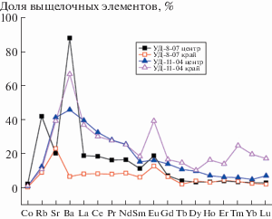 Как видно на рис. 3, краевая и центральная части образца УД-8-07 имеют одинаковый характер распределения РЗЭ, однако абсолютные концентрации в краевой части на порядок выше. Распределения РЗЭ в выщелочках аналогичны распределению в породе. Разные части ксенолита и выщелочек демонстрируют сильную Eu-аномалию. Другая картина наблюдается в образце УД-11-04 (рис. 3). Центральная часть и выщелочка имеют близкое распределение РЗЭ без отчетливой Eu-аномалии, при этом краевая часть и выщелочка из нее характеризуются положительной Eu-аномалией.
