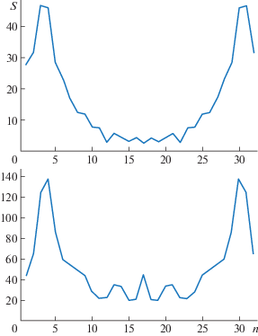 На рис. 1 в качестве примеров приведены полученные с помощью дискретного преобразования Фурье и пакета Wolfram Mathematica спектры последовательностей тангенсов угла наклона поверхности воды, умноженных на 104, для двух режимов движения эллипсоида. По горизонтальным осям отложены номера гармоник n, по вертикальным – модули их комплексных амплитуд s. Для большей наглядности точки графиков соединены отрезками прямых. Первый режим (верхний график) соответствует глубине H = 96 мм и скорости V = 450 мм/ с, второй (нижний график) – H = 66 мм, V = 424 мм/с.