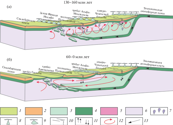 Геодинамическая эволюция арктического региона в мезозое: (а) – поздняя юра–ранний палеоцен, (б) – средний палеоцен–современность. 1 – осадочный чехол, 2 – кора континентального типа, 3 – кора океанического типа, 4 – подкоровая литосфера, 5 – астеносфера мантии, 6 – верхняя мантия, 7 – продукты дезинтеграции и плавления океанической литосферы, 8 – вулканизм островодужного типа, 9 – трещинный вулканизм платформенного типа, 10 – разрывные нарушения, 11 – векторы направлений воздымания и проседания литосферной плиты, 12 – конвективные течения в мантии, 13 – направление движения океанической литосферы.