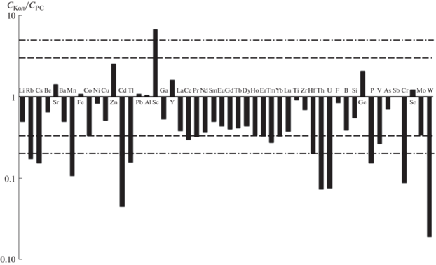 Сравнение средних концентраций растворенных микроэлементов в водах устьевого участка р. Колымы (СКол, данная работа) с мировым уровнем (СРС [3]). Штриховыми и штрихпунктирными линиями показаны соответственно различия в 3 и 5 раз.