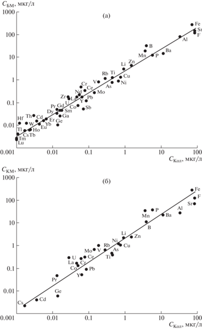 Наряду с этим в сходных природно-климатических условиях (в пределах арктической зоны) наблюдается зависимость концентраций растворенных микроэлементов в речных водах от величины их минерализации. Как показано на рис. 2, установлена тесная положительная корреляция между средними концентрациями растворенных микроэлементов в водах устьевых участков р. Колымы (СКол, мкг/л), с одной стороны, и рек водосборов Белого и Карского морей (СБМ и СКМ, мкг/л), с другой: