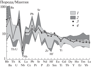 В составе Каменского террейна объединены интрузии береинского габбро-диорит-тоналитового комплекса и тесно пространственно связанные с ними вулканогенно-осадочные образования каменской свиты [9]. Последняя представляет собой переслаивание осадочных пород – вулканомиктовых конглобрекчий и гравелитов, а также туфопесчаников и туфоаргиллитов, с вулканитами базальт-андезибазальт-андезит-дацит-риолитовой серии. Вулканиты претерпели глубокие зеленокаменные изменения. Разрезы свиты характеризуются резкой изменчивостью и распределение вулканитов в них неравномерное. Габбро и диориты Береинского комплекса тесно пространственно связаны с вулканогенно-осадочной толщей, образуя в ней дайки, многочисленные апофизы и мелкие интрузивные тела. В результате изотопного датирования габбро-диоритов по цирконам U–Pb-методом на SHRIMP-II (Центр изотопных исследований ВСЕГЕИ) был получен возраст 254.3 ± 5.1 млн лет [10], что соответствует поздней перми. Это позволяет принять и возраст вмещающей вулканогенно-осадочной толщи как позднепермский. Вулканиты свиты принадлежат к серии нормальной суммарной щелочности и умеренной калиевости. Немногочисленные составы базальтов попадают в категорию субщелочных. Нормированные спектры распределения редких земель в базальтах, андезибазальтах, андезитах и риолитах являются умеренно обогащенными – La/Yb(N) = 1.96–4.31. Мультикомпонентная диаграмма базальтов каменской свиты (рис. 2) демонстрирует характеристики, типичные для островодужных вулканитов – высокий уровень накопления K, Rb, Ba, Sr, Ba и резкое преобладание LILE над HFSE, что является характерным признаком пород, связанных своим происхождением с зоной субдукции.
