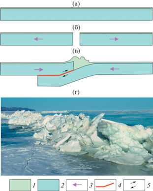 Схематичное отображение формирования в ледовом покрове (а) становой трещины отрыва (б), последующей ее трансформации в поддвиг при термальном расширении льда (в). г – Фото сформировавшейся зоны поддвига в ледовом покрове оз. Байкал. 1 – снег; 2 – лед; 3 – направление перемещения ледовых пластин; 4 – периодически активизирующийся контакт между ледовыми пластинами; 5 – направление относительного перемещения ледовых пластин при активизации контакта между ними.