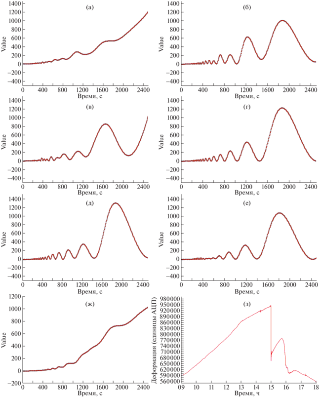 Спектрограммы временного ряда деформаций ледового покрова с 9 ч до 16 ч 07 марта 2021 г. для почасовых интервалов: 9‒10 ч (а); 10‒11 ч (б); 11‒12 ч (в); 12‒13 ч (г); 13‒14 ч (д); 14‒15 ч (е); 15‒16 ч (ж). з – графическое отображение исходных данных.