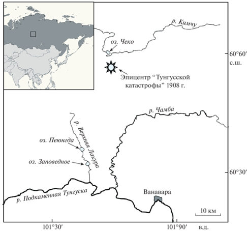 Озеро Заповедное (60°31.688′ с.ш., 101°43.740′ в.д.) – небольшой водоем почти круглой формы диаметром около 500 м, расположенный на границе Государственного природного заповедника “Тунгусский” (Эвенкийский район Красноярского края), в 60 км от поселка Ванавара, и приблизительно в 60 км к югу от озера Чеко и предполагаемого эпицентра взрыва 1908 г. Озеро Пеюнгда (60°37.174′ с.ш., 101°38.442′ в.д.) также имеет почти правильную округлую форму диаметром около 600 м, и расположено в 12 км к северо-западу от оз. Заповедное. Через оба озера протекает небольшая река Верхняя Лакура, приток реки Подкаменная Тунгуска (рис. 1).