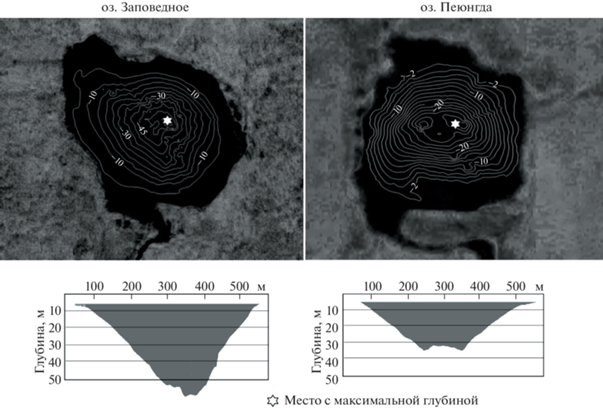 Было выяснено, что максимальная глубина озера Заповедное равна 60.3 м в точке, 60°31.688′ с.ш., 101°43.740′ в.д., расположенной вблизи геометрического центра водоема, ближе к восточному берегу (рис. 2). Дно озера имеет форму конической воронки (рис. 2), если не считать мелководную прибрежную зону. Склоны дна озера слабо-ассимметричные, северо-восточный склон несколько более крутой, чем остальные. Отношение глубина/диаметр составляет около 0.1. Таким образом, озеро Заповедное по форме и размерам можно считать аналогом озера Чеко (рис. 2). Озеро Пеюнгда имеет также коническую форму с двумя углублениями в центральной части, максимальная глубина 34.6 м в точке 60°37.174′ с.ш., 101°38.442′ в.д. (рис. 2).