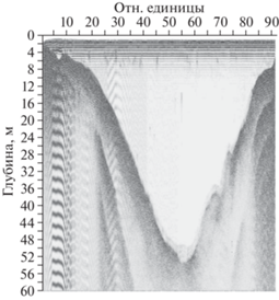 Сейсмоакустическое профилирование показало, что видимая мощность донных отложений оз. Заповедное в районе максимальной глубины достигает 4 м (рис. 3 а). На глубине 38 и 28 м в правой части разреза наблюдаются выступы, на склоне которых залегают донные отложения. На сейсмоакустическом разрезе оз. Пеюнгда в районе максимальной глубины донные отложения в левой и правой части разреза залегают относительно параллельно, в центральной части наблюдается понижение с прогибанием осей синфазности (рис. 4 а). Вероятно, погружение связано с карстовыми процессами. Погружение было плавное, так как слоистость до критического момента сохранена, а дальше в эпицентре погружения наблюдается хаотическая картина акустической записи. Максимальная глубина в данном разрезе составила 31 м, донные отложения здесь достигают 4 м. На сейсмоакустическом разрезе, расположенном на некотором расстоянии от центра, на глубине 23 м, мощность отложений составила также 4 м, в правой части разреза потеря корреляции слоистого разреза, вероятно, связана с наличием газа в отложениях (рис. 4 б).