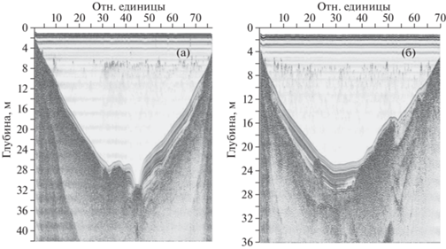 Сейсмоакустические профили дна озера Пеюнгда. а – в районе максимальной глубины, б – в стороне от центра озера.