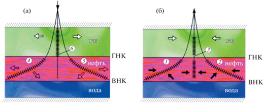 При наличии контактирующих газовой шапки и нефтяной оторочки флюидальная система обычно находится в системе локального термодинамического равновесия. И газ обогащен компонентами C5+вышекипящие, а нефть содержит определенное количество растворенного газа. Запасы нефти в подобной ситуации являются наиболее проблемными и требуют упреждающих усилий по обеспечению полноты их извлечения. Поэтому НО должна разрабатываться опережающими темпами. Для разработки НО предлагается использовать системы на основе горизонтальных скважин (см. рис. 1). Здесь и добывающая, и нагнетательная скважины реализуются в варианте многозабойных с псевдо-горизонтальными стволами. В материнском стволе добывающей скважины на всю толщину вскрываются нефтяная оторочка и часть газонасыщенного интервала для притекания жирного (содержащего конденсат) газа (цифра 3 на рис. 1 а). Боковыми псевдо-горизонтальными стволами (цифры 1 и 2 на рис. 1 а) добываются нефть, вода и прорывной газ вместе с конденсатом. Вся добываемая продукция в режиме естественного газ-лифта подается на поверхность, по одной колонне насосно-компрессорных труб (НКТ) в материнском стволе. В нагнетательной скважине вода, проходя по затрубному пространству, нагнетается в нефтяную оторочку через боковые стволы (цифры 4, 5 на рис. 1 б), при установленном пакере в затрубном пространстве. Материнский ствол вскрывается только в газоконденсатной шапке (цифра 6 на рис. 1 б) для закачки сухого газа.