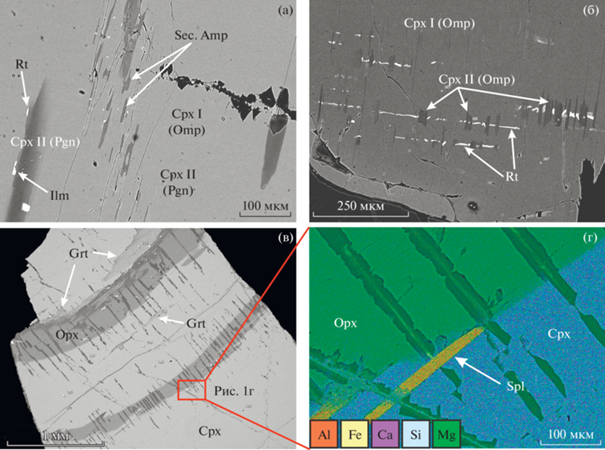 Структуры распада в породообразующих клинопироксенах из мантийных ксенолитов трубки Обнаженная (BSE-изображения). (а) Рутил (Rt), ильменит (Ilm) и клинопироксен (пижонит – Cpx II (Pgn)) в виде ламелей во вмещающем клинопироксене (Cpx I) из ксенолита Об-149. Sec. Amp – вторичный амфибол. (б) Омфацит (Cpx I (Omp)), содержащий в качестве продуктов распада рутил (Rt), и новообразованный омфацит (Cpx II (Omp)). Образец Об-28. (в) Ламели граната (Grt) светло-серого цвета и ортопироксена (Opx) темно-серого цвета в клинопироксене из вебстрита Об-138. Самые темные ламелеподобные структуры, секущие ламели ортопироксена, – частично серпентинизированные трещины. (г) Мультиэлементная карта отдельного фрагмента (красная область на рис. 1 в) с фазами распада во вмещающем клинопироксене из вебстрита Об-138. Цвета, указанные для Al, Fe, Ca, Si и Mg, – их относительные концентрации. Чем ярче цвет, тем выше относительная концентрация элемента.