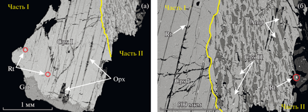Пироксенит Об-138 содержит клинопироксен с фазами распада, представленными гранатом, ортопироксеном, рутилом и шпинелью (рис. 1 в и г). Этот клинопироксен показывает следы поздней перекристаллизации. По морфологическим признакам и содержащимся в нем фазам распада, он может быть разделен на две части (рис. 2). Исходная неизмененная часть I сложена диопсидом (табл. 1). Перекристаллизованная часть II сложена диопсидом с меньшим содержанием Al2O3 (3.4 vs 6.0 мас. %) и Na2O (1.8 vs 2.8 мас. %) и повышенным – MgO (15.8 vs 14.5 мас. %) и CaO (22.0 vs 20.5 мас. %). Амфибол – паргасит занимает около 50% в перекристаллизованной части зерна (часть II на рис. 2). Кроме того, в измененной части II рутил обогащен Cr2O3 (3.1 мас. %, табл. 1). Из-за малых размеров зерен рутила из части I (рис. 2) представительных анализов получить не удалось; однако спектры элементов, полученные на электронном микроскопе с энерогодисперсионным спектрометром, показали отсутствие Cr2O3 в рутиле.