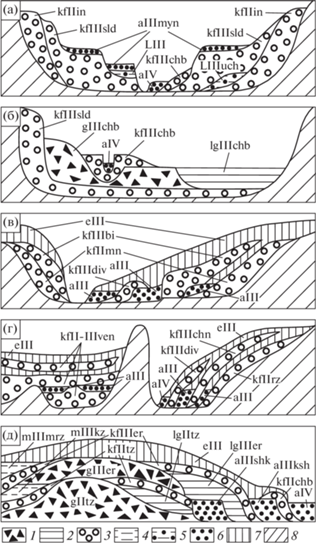 Схемы взаимоотношений четвертичных отложений в магистральных долинах Западной Сибири. а – Долины Чуи и Катуни (Горный Алтай). б – район ветвления долины Чуи на “старую” и “новую” (Горный Алтай). в – Бийско-Барнаульское расширение Оби. г – Южно-Минусинская котловина и верхнее течение Енисея. Д – Нижняя Обь. 1 – морены; 2 – подпрудный лимногляциал; 3 – суперпаводковые отложения (катафлювиал); 4 – мариний; 5 – лимний; 6 – аллювий; 7 – субаэральный покров; 8 – дочетвертичные отложения магистральных долин. Стратогенетические индексы местных стратиграфических подразделений: kf II-IIII en kf II in – ининский катафлювиал; l III uch – усть-чуйский лимний; kf III sld – сальджарский катафлювиал; чибитский гляциокомплекс: g III chb – морена; lg III chb – лимногляциал; kf III chb – катафлювиал; kf II mn – монастырская толща; kf III bi – бийский катафлювиал; f III bpl – платовский катафлювиал; kf II rz – разлогский катафлювиал; kf III chn – чанинский катафлювиал; Kf III dvn – дивнинский катафлювиал; верхнечетвертичный мариний: m III kr – каргинский; m III mrz – морозовский; верхнечетвертичный аллювий: а III shk – шурышкарский; а III myn – малояломанский а III ksh – кушеватский; a IV – голоценовый аллювий; e III – верхнечетвертичный субаэральный покров.