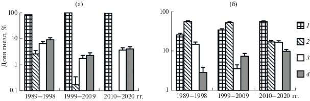 Доля гнезд (среднее ± SE) массовых видов дуплогнездников (1 – мухоловка-пеструшка, 2 – обыкновенная горихвостка, 3 – большая синица, 4 – московка) в разные периоды в фоновой (а) и импактной (б) зонах (два биотопа объединены).