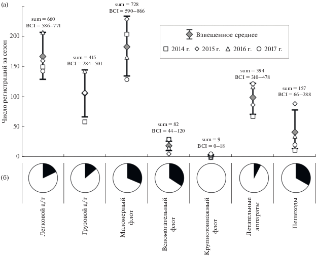 Антропогенное воздействие на агрегацию тюленей по категориям транспорта (а): размахом указаны взвешенные средние и доверительные интервалы для взвешенных средних (перцентильный бутстреп), приведены суммарные значения по регистрациям за 2014–2017 гг. (sum) и доверительные интервалы для суммарных значений (BCI, перцентильный бутстреп); б – вероятность причинения тюленям значительного беспокойства (черные сектора) для каждой категории транспорта.