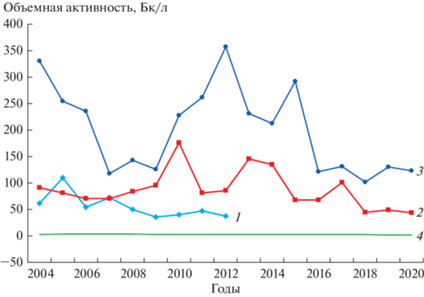 Динамика объемной активности 3H в атмосферных осадках и в р. Тече в зоне наблюдения ПО “Маяк”. Использованы данные ежегодников “Радиационная обстановка на территории России и сопредельных государств”, издаваемых НПО “Тайфун” в 2004–2020 гг.: 1 – атмосферные осадки (пос. Новогорный); 2 – р. Теча (пос. Затеченское); 3 – р. Теча (пос. Муслюмово); 4 – фоновый уровень.