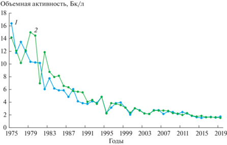 Обобщенные данные о содержании трития в речных водах по сравнению с атмосферными осадками, выпавшими на территории бывшего СССР и России за период с 1975 г., приведены в обзоре [150] и ежегодниках Росгидромета [36, 151]. Для всего периода наблюдений (рис. 7) характерно снижение среднегодовых фоновых значений объемной активности трития в атмосферных осадках, что связано с постепенным истощением стратосферного резервуара трития, сформировавшегося в период ядерных испытаний. Поскольку содержание трития в речной воде коррелирует с его концентрацией в атмосферных осадках (R2 = 0.84, p = 0.00001), для последних лет наблюдений характерна минимальная объемная активность трития в поверхностных водах. В обзорной публикации [150] рассмотрены также меридиональные закономерности распределения трития в речных водах и его сток. Показано, что в местах расположения радиационно-опасных объектов наблюдается повышенное содержание трития в природных водах. При этом при соблюдении общих правил безопасной эксплуатации предприятий атомной промышленности и разумном водопользовании сбросы трития от проектируемых АЭС могут с запасом удовлетворять требованиям, установленным в Нормах радиационной безопасности (НРБ-99/2009) [152].