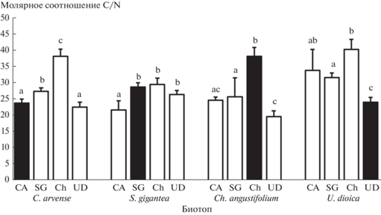 Соотношение C/N в опаде 4 видов растений (CA – C. arvense, SG – S. gigantea, Ch – Ch. angustifolium, UD – U. dioica) после инкубации в разных биотопах (черные столбики обозначают вид опада, который инкубировался в “домашнем” биотопе). На рис. 1, 2 и 4 показаны среднее значение и стандартное отклонение (n = 5); разными буквами обозначены значимые различия в пределах одного биотопа (критерий Тьюки, p < 0.05).