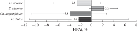 Индексы “преимущества домашнего поля” (HFAi), отражающие увеличение скорости деструкции опада 4 видов растений в “своем” биотопе. Приведены средние значения и 95%-ные доверительные интервалы (для нормального распределения), полученные методом бутстреппинга. Включение нуля в доверительный интервал свидетельствует об отсутствии значимых отличий от нуля.
