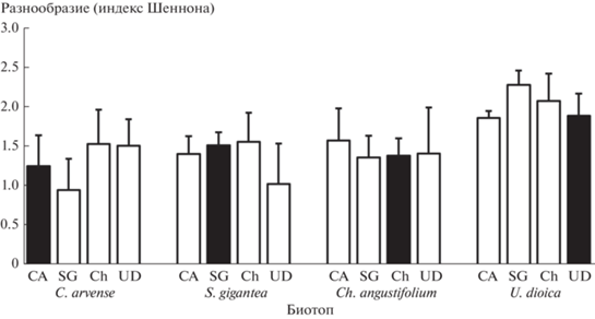 Разнообразие организмов, измеренное с помощью индекса Шеннона, в опаде 4 видов растений (CA – C. arvense, SG – S. gigantea, Ch – Ch. angustifolium, UD – U. dioica) при инкубации в разных биотопах (черные столбики обозначают вид опада, который инкубировался в “домашнем” биотопе). Критерий Тьюки не выявил значимых различий между разными видами опада.