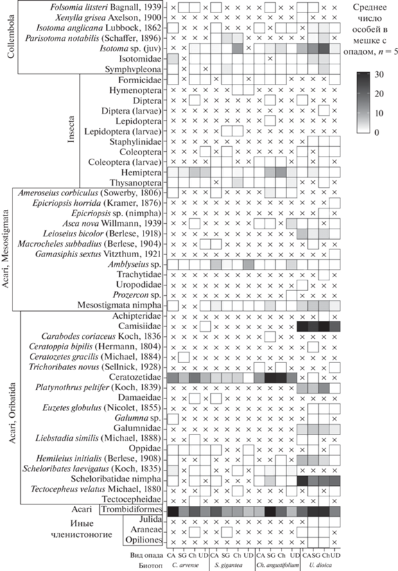 Численность организмов в разных видах опада (CA – C. arvense, SG – S. gigantea, Ch – Ch. angustifolium, UD – U. dioica) и разных биотопах. Крестиком отмечено отсутствие данного таксона в соответствующих пробах.
