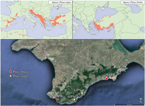 На южном берегу полуострова Крым произрастают два родственных вида рода Pinus: P. brutia и P. nigra, естественные древостои которых занимают большие площади в основном на южных склонах Главной гряды Крымских гор [31, 32]. Оба вида имеют пересекающиеся ареалы [33, 34], считаются засухоустойчивыми, способны произрастать на обедненных маломощных почвах. Основное различие заключается в высотном диапазоне их распространения: оптимальный высотный диапазон для произрастания P. nigra находится в пределах 800–1500 м над ур. м., для P. brutia – 0–600 м.