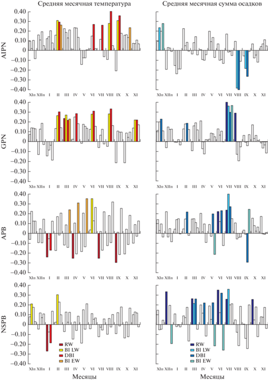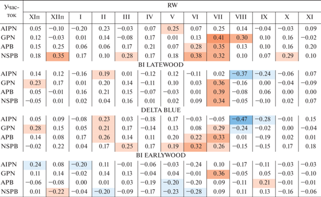 Коэффициенты корреляции между индексами радиального прироста (RW), показателями BI: поздней древесины (BI LW), ранней древесины (BI EW), дельта BI (ΔBI), и климатическими переменными: температурой воздуха и количеством осадков с ноября предшествующего года (ХIп) по ноябрь текущего года роста для общего периода с 1950 г. по 2018 г. Заливкой отмечены только достоверно отличающиеся от 0 (при p < 0.05) коэффициенты. Буквой “п” отмечены месяцы предыдущего года.