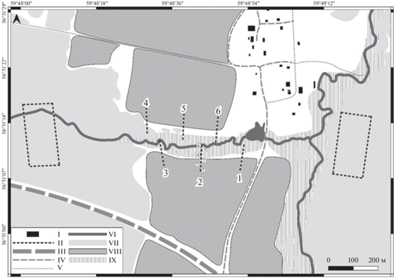 Пространственный план эксперимента: I – здания; II – площадки мечения и линии заборчиков; III – асфальтированные дороги; IV – гравийные дороги; V – грунтовые дороги; VI – реки; VII – лес; VII – обрабатываемые поля; IX – прирусловая растительность; крупные цифры – номера учетных линий, мелкие – номера цилиндров.