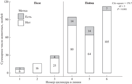 Суммарное число отловленных и помеченных животных в зависимости от положения цилиндра в линии.