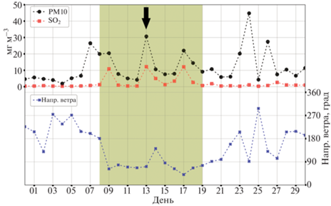 Временной ряд среднесуточных приземных концентраций PM10 и SO2 и направлений ветра по данным со станции Inari Raja-Jooseppi (ID станции 102009, 68.48 с.ш. и 28.30 в.д.) за июнь 2011 г. Прямоугольной областью выделен исследуемый интервал времени с повышенными приземными концентрациями загрязнителей и соответствующих направлений ветра с территории Кольского полуострова. Стрелкой показан исследуемый пример относительно высоких значений содержания PM10 и SO2 в приземном воздухе.