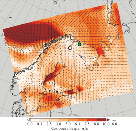На рис. 2 представлено среднесуточное за 13 июня 2011 г. пространственное распределение приземных скоростей и направлений ветра в пределах области исследования по данным численного моделирования Enviro-HIRLAM. В среднем, на территории Кольского полуострова и северной части Финляндии 13-го июня 2011 г. у поверхности Земли по данным моделирования преобладали В-СВ направления ветра. В соседние дни по данным моделирования направления ветра были примерно такими же. Необходимо отметить, что над территорией Баренцева моря, у берегов Кольского полуострова направления ветра также составляли В-СВ и ЮВ. Из этого можно предположить, что повышенная приземная концентрация SO2 на границе России и Финляндии 13-го июня 2011 г. (рис. 1) могла быть вызвана переносом воздушных масс как с территории Кольского полуострова, так и от более удаленного источника. Одним из таких источников может быть ГМК г. Норильска (удаленность ~2280 км), попадающая по своему положению в диапазон направлений приземного ветра на территории исследования.