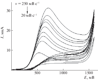 $\begin{gathered} {{E}_{{{\text{p,а }}}}} = {{E}^{0}} + RT{\text{/}}(2\alpha {{n}_{\alpha }}F) \times \\ \times \;\{ \ln [(RT{{k}_{{\text{s}}}}){\text{/}}(\alpha {{n}_{\alpha }}F)]--\ln \nu \} , \\ \end{gathered} $Для необратимых анодных процессов величина Ip.а может быть вычислена по уравнению Рэндлса–Шевчика [16]: