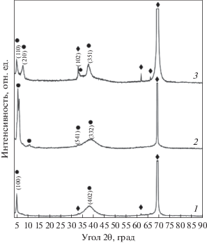 Рентгенограммы сверхструктур в покрытиях системы Та–Ве при концентрации бериллия 35.0 (1), 51.4 (2) и 70.7 ат. % (3); ◆ – кремний (подложка), ⚫ – сверхструктуры Та–Ве.