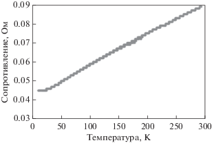 На рис. 5 приведена зависимость электросопротивления от температуры образца со сформированной на поверхности фазой Та3Ве. Видно, что для данного интерметаллида характерна зависимость R(T), свойственная металлам – сопротивление образца при понижении температуры линейно снижается до некоторого порогового значения. Сверхпроводящих свойств у интерметаллида Та3Ве при охлаждении до 10 К не обнаружено.