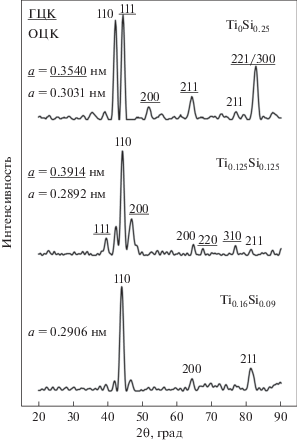 Рентгенограммы сплавов Si0.09, Si0.125 и Si0.25 с данными по параметрам решетки (ГЦК фазу можно рассматривать как примитивную кубическую из-за наличия так называемых сверхструктурных отражений). Подчеркнутые значения параметров решетки и индексов Миллера дифракционных линий относятся к ГЦК фазе.