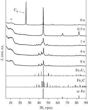 Дифрактограммы образца с фуллеритом Fe–75С60/70 (рис. 1) до 4 ч МС характеризуются присутствием уширенных рефлексов α-Fe. При этом линии карбидов имеют существенно меньшую интенсивность (практически на уровне фона). Из сравнения с представленными на рисунке штрихдифрактограммами после 1–2.5 ч МС эти линии соответствуют цементиту Fe3C, а после 3–4 ч размола – Fe3C и высокоуглеродистому карбиду Экстрeма–Адкокка Fe7C3. При МС в течение 8 ч интенсивность рефлексов карбидов увеличивается, а линии α-Fe на дифрактограмме отсутствуют.