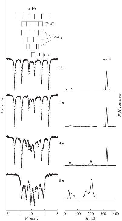 В мёссбауэровских спектрах Fe–75С60/70 (рис. 4) уже после 0.5 ч МС наряду с компонентой от α-Fe (H = 330 кЭ) присутствует парамагнитный дублет с изомерным сдвигом относительно α-Fe при комнатной температуре δ = 0.37 мм/с и квадрупольным расщеплением Δ = 0.98 мм/с. Указанные параметры сверхтонкого взаимодействия одного порядка с полученными ранее δ = 0.34 мм/с и Δ = 0.98 мм/с для парамагнитной фазы при МС железо–25 ат. % фуллерит–толуол [9]. Аналогично работе [9], обозначим соответствующую данной компоненте фазу П-фаза.