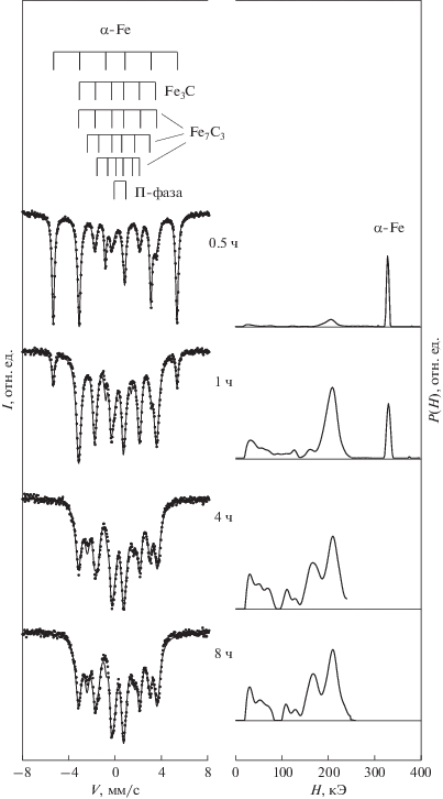 После 4 ч МС в спектре отчетливо проявляется компонента с параметрами Н = 203 кЭ и δ = = 0.19 мм/с, которые удовлетворительно согласуются с литературными данными для цементита [13]. Широкие линии в цементитной составляющей спектра (Г1.6 = 0.53 мм/с) обусловлены его искаженной структурой в результате механического воздействия. При дальнейшем МС до 8 ч в функции Р(Н) помимо увеличенной по интенсивности компоненты цементита проявляются компоненты с Н < 203 кЭ, не имеющие к нему отношения. Математическая обработка в дискретном представлении позволила выделить три составляющие с Н = 207 кЭ, H = 168 кЭ, Н = 103 кЭ, которые согласуются с литературными данными для карбида Экстрёма–Адкокка Fe7C3 [14]. Поскольку наиболее интенсивные компоненты для карбидов Fe7C3 и Fe3C имеют близкие значения Н, то разделить вклады каждого из карбидов затруднительно. В табл. 1 приведена суммарная доля атомов Fe в Fe3C и Fe7C3. Доля свободного железа в процессе синтеза уменьшается до 44 ат. % после 4 ч МС, а после 8 ч – α-Fe в образце отсутствует в пределах погрешности измерения.