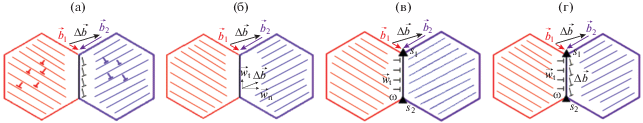 Дефекты в границах зародышей рекристаллизации. а – формирование ДОН (обозначены черным) в границе зерен при прохождении дислокаций из зерна 1 (нарисовано красным, вектор Бюргерса действующей системы скольжения ${{\vec {b}}_{1}}$) в зерно 2 (нарисовано синим, вектор Бюргерса действующей системы скольжения ${{\vec {b}}_{2}}$); б – делокализация ДОН в границах с образованием тангенциальных компонент плотностью wt и нормальных плотностью wn; в – дефекты, сформировавшиеся в границе после делокализации ДОН: тангенциальные компоненты делокализованных дислокаций плотностью wt и стыковые дисклинационные диполи мощностью ω; г – полный ансамбль дефектов в границах зародышей рекристаллизации: ДОН плотностью ρb∆b, тангенциальные компоненты продуктов их делокализации плотностью wt и стыковые дисклинационные диполи мощностью ω.