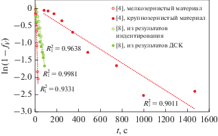 Графики зависимости объемной доли рекристаллизованного материала от времени отжига, построенные в координатах ln(1 – fV)–t на основе экспериментальных данных [11].