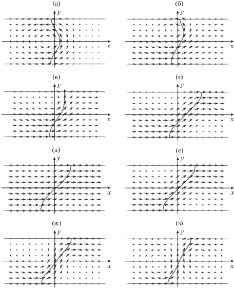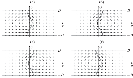 $\begin{gathered} {{m}_{{x0}}}(x,y) = {{m}_{{x1}}}(x);\,\,\,{{m}_{{y0}}}(x,y) = {{m}_{{y1}}}(x); \\ {{m}_{{z0}}}(x,y) = {{m}_{{z1}}}(x). \\ \end{gathered} $Направляющие косинусы (16) служат в качестве исходных зависимостей при решении уравнения Брауна (11) совместно c выражениями для составляющих эффективного поля (12) и граничных условий (13) и (14). При изменении угла $\varphi $ от 0° до 360° были получены четыре различных одновихревых двумерных распределения намагниченности 180° ДГ Блоха (рис. 1). Эти четыре различных распределения можно сгруппировать в две пары: 1) в середине пленки (у = 0) намагниченность направлена вверх (рис. 1а, 1б) или направлена вниз (рис. 1в, 1г); 2) каждую пару можно характеризовать различным направлением вращения намагниченности (вихрь): левый вихрь, когда вращение намагниченности происходит против часовой стрелки (рис. 1a, 1в) и правый вихрь, когда вращение намагниченности происходит по часовой стрелке (рис. 1б, 1г).