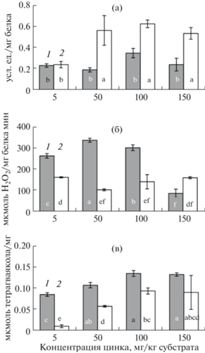 Активность CОД (а), КАТ (б), ГвПО (в) в листьях 1 – B. juncea сорт Славянка и 2 – S. alba сорт Бельгия, при разных концентрациях цинка в субстрате. Разными латинскими буквами отмечены статистически значимые различия между средними значениями при P < 0.05.