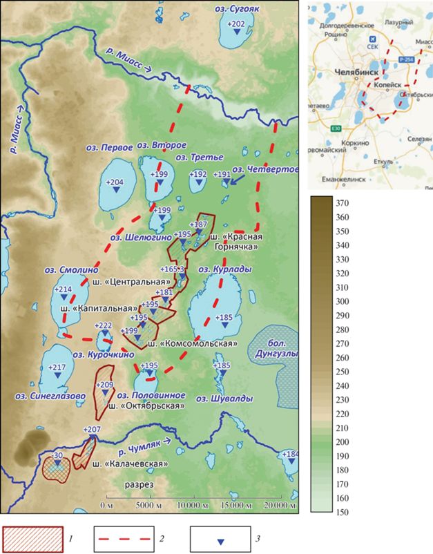 Схема расположения шахтных полей и гидрографическая сеть района. 1 – горный отвод; 2 – граница водосборной площади шахт северной части ЧУБ (граница геофильтрационной модели); 3 – отметка уровня воды в водоемах.