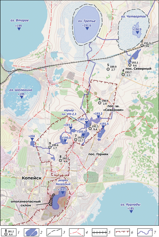 Разрез Копейский, шахта “Центральная”. Разрез Копейский затапливается с 2004 г., водоотлив из ш. “Центральная” прекращен в 2006 г. На западном борту разреза находятся промплощадка Копейского машиностроительного завода и селитебная территория г. Копейск. В процессе затопления на западном борту карьера произошло несколько оползней. После схода самого крупного оползня в 2015 г. дневная поверхность просела на 15 м вблизи территории Копейского машиностроительного завода. Весной 2019 г. откос оползневого участка был укреплен отсыпкой грунта. В настоящее время Уральский филиал ВНИМИ осуществляет геомеханический мониторинг; подвижки грунтовых реперов отсутствуют.