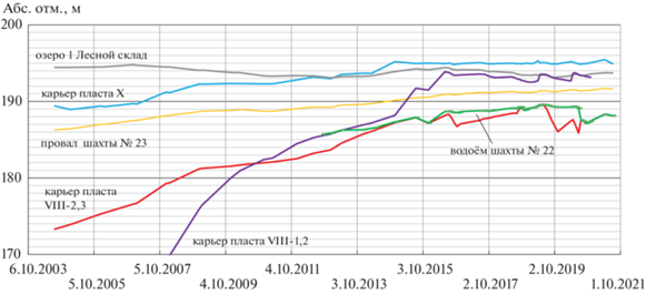 Установившееся значение уровня воды в затопленных провалах и карьерах составляет от 192.2 м в провале шахты № 23 до 195.1 м в карьере пласта X (см. рис. 4).