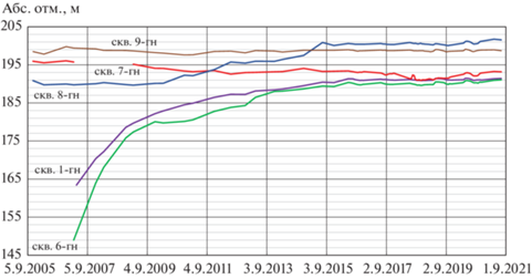 На центральном и южном участках горного отвода процесс заполнения депрессионной воронки практически завершился (рис. 5). Глубина залегания уровня подземных вод изменяется 1.7 м от скв. 9-гн (на северной окраине пос. Новостройка) до 12.7 м в скв. 7-гн между озерами карьера пласта YIII-1,2 и Лесной склад.