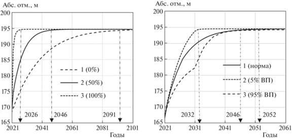 Прогнозные задачи были направлены на оценку скорости затопления разреза “Копейский” при реализации 3 сценариев: 1) без проведения каких-либо мероприятий; 2) при проведении мероприятий по укреплению западного борта разреза (засыпка половины емкости разреза); 3) полная засыпка разреза (рис. 8а). Для определения влияния водности периода рассматривались 3 сценария (при условии засыпки половины емкости разреза): 1) 10 лет повышенной водности; 2) весь период затопления нормальная водность; 3) 10 лет низкой водности (рис. 8б).